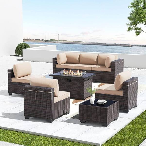 8-Piece Wicker Patio Conversation Set with 55000 BTU Gas Fire Pit Table and Glass Coffee Table and Sand Cushions