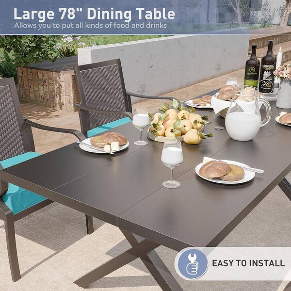 9-Piece Metal Outdoor Dining Set with Rattan Woven Backrest, an Umbrella Hole and Blue Cushion