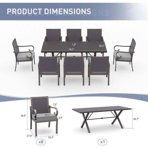 9-Piece Metal Outdoor Dining Set with Rattan Woven Backrest, an Umbrella Hole and Grey Cushion