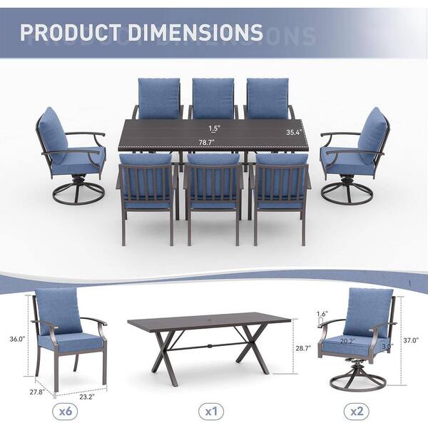 9-Piece Metal Patio Outdoor Dining Set with 2 Swivel Chairs, 6 Chairs, Large Table, Umbrella Hole and Navy Blue Cushions