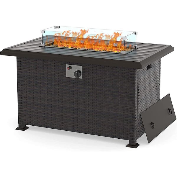Brown 43 in. 55000 BTU Wicker Propane Outdoor Fire Pit Table with Glass Wind Guard Lid Fire Glass Beads