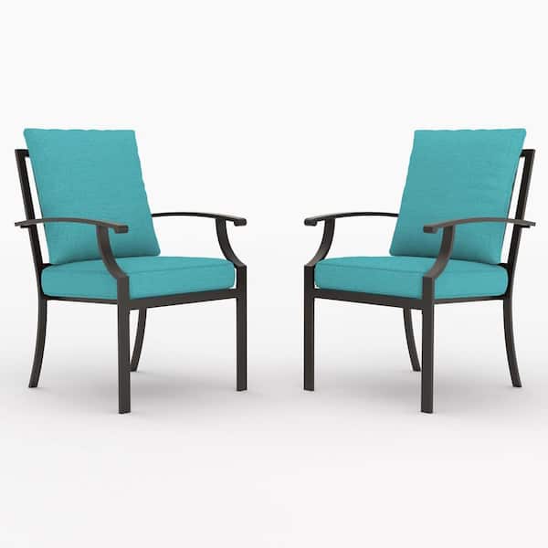 Brown Patio Metal Outdoor Dining/Side/Restaurant Chairs with Modern, Curved Armrests and Blue Cushions (2-Pack)