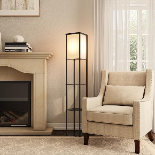 62.75 in. Black Shelf Floor Lamp with Ivory Fabric Lamp Shade