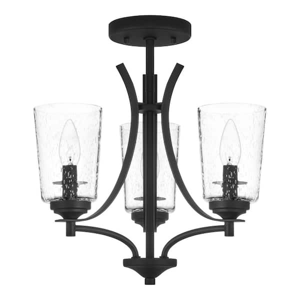 • Matte black semi-flush accentuated with clear seedy glass shades