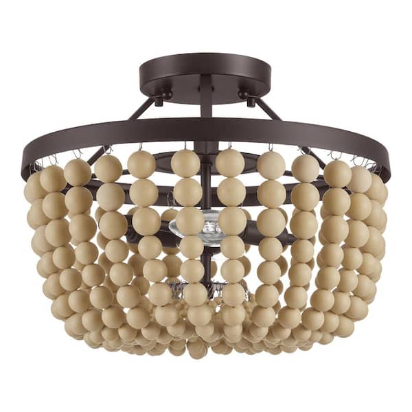 Cayman 13 in. 2-Light Bronze and Faux Wood Beaded Semi-Flush Mount Ceiling Light Fixture with Beaded Shade