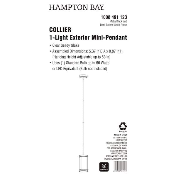 Collier 53 in. 1-Light Matte Black and Darker Brown Outdoor Hanging Light Mini-Pendant Light with Clear Seeded Glass
