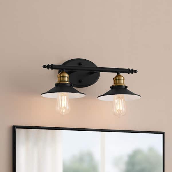 Glenhurst 16 in. 2-Light Industrial Farmhouse Black and Brass Bathroom Vanity Light Fixture with Metal Shades