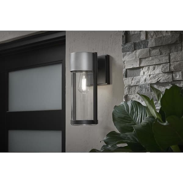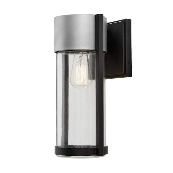 Kempster 14 in. Modern 1-Light Brushed Nickel and Black Modern Outdoor Wall Cylinder Light with Clear Glass