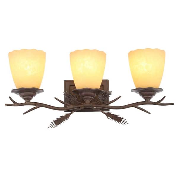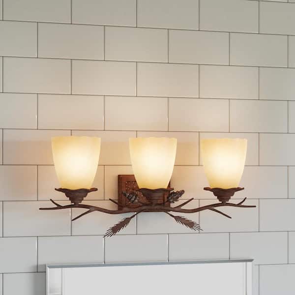 Lodge 3-Light Weathered Spruce Rustic Bathroom Vanity Light with Sunset Glass Shades
