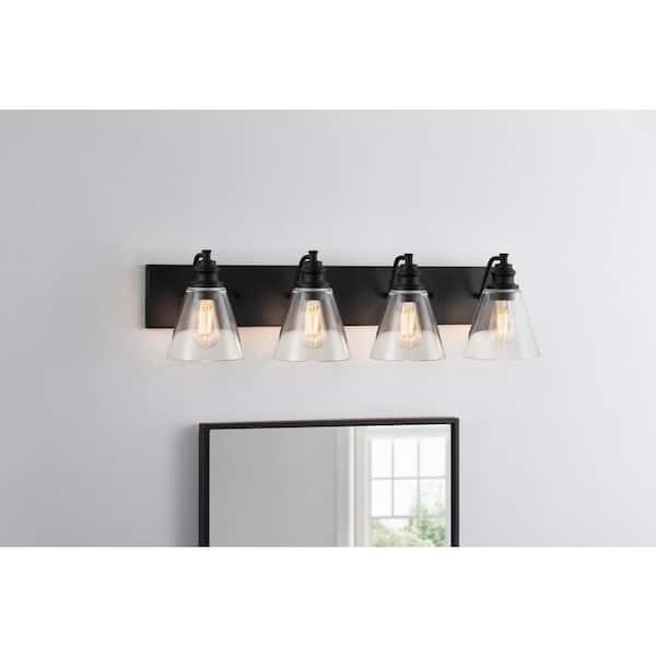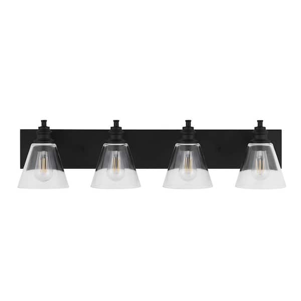 Manor 33 in. 4-Light Matte Black Industrial Bathroom Vanity Light with Clear Glass Shades