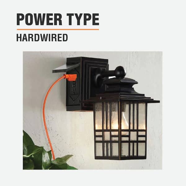Mission 12.9 in. 1-Light Black with Bronze Highlight Outdoor Wall Light Lantern Sconce with Built-In Electrical Outlet