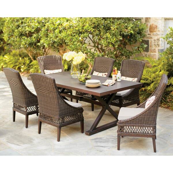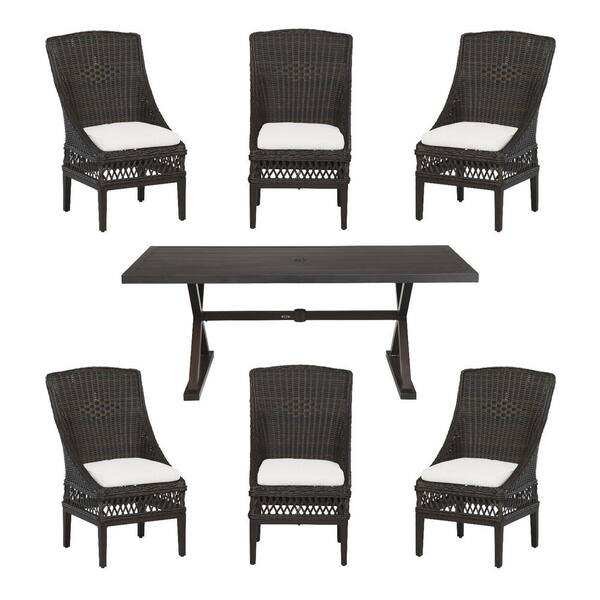 Woodbury Dark Brown 7-Piece Wicker Outdoor Patio Dining Set with CushionGuard Chalk White Cushions