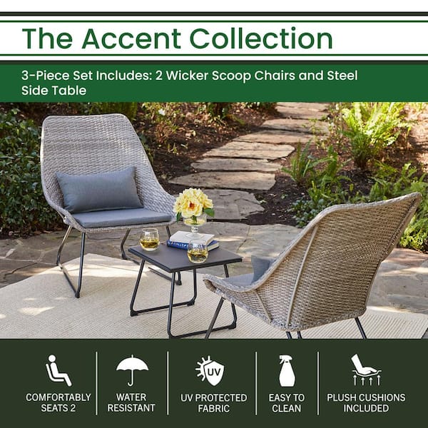 3-Piece Wicker Bistro Set Modern Outdoor Furniture Set 2 Chairs, 15in. Side Table w/ Steel Frames and Gray Cushions