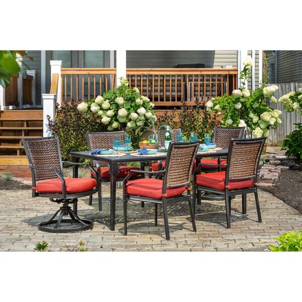 Mercer 7-Piece Aluminum Outdoor Dining Set with Crimson Red Cushions, 4 Dining Chairs 2 Swivel Rockers and Table