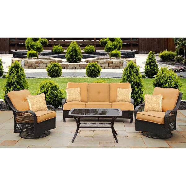 Orleans Brown 4-Piece All-Weather Wicker Patio Deep Seating Set w/ Sahara Sand Cushions, 4 Pillows, Glass Coffee Table