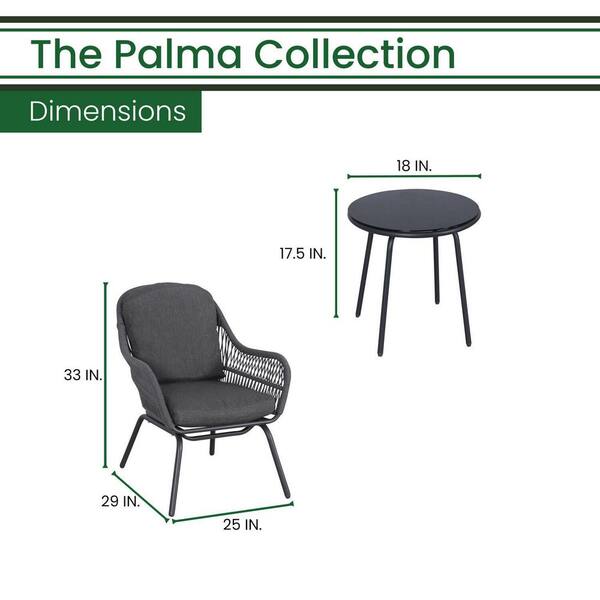 Palma 3-Piece Metal Outdoor Bistro Chat Set with 2 Rope Chairs, Gray Cushions and Black Painted Glass-Top Side Table