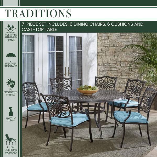 Traditions 7-Piece Aluminum Outdoor Dining Set with Blue Cushions and Cast-Top Table