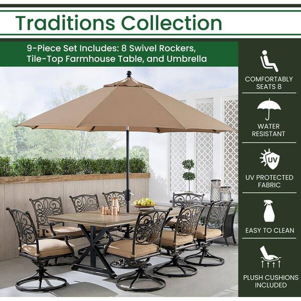 Traditions 9-Piece Aluminum Outdoor Dining Set with Tan Cushions, 8 Swivel Rockers, Tile Top Table and Umbrella