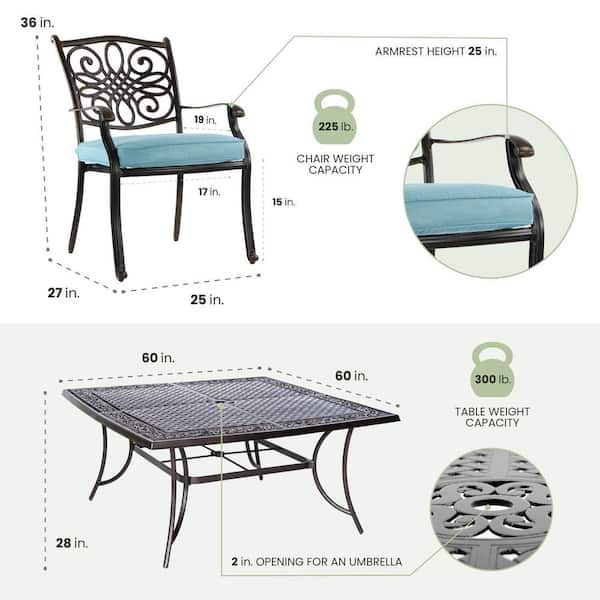 Traditions 9-Piece Aluminum Outdoor Square Patio Dining Set with Blue Cushions