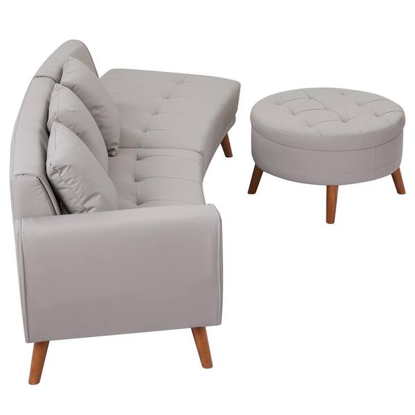 107 in W Square Arm Faux Leather Rectangle Sofa in. Gray with Round Button-Tufted Storage Ottoman, 3 Removable Pillows