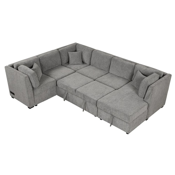 108.6 in. Chenille Sectional Sofa in. Light Gray with 2 USB Ports, 2 Power Sockets, 3 Back Pillows, Storage Chaise