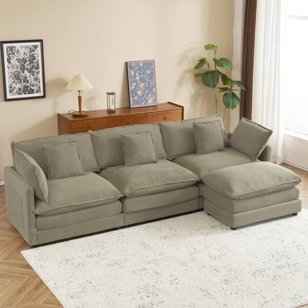 112.6 in. Modular Corduroy Fabric Cloud Sectional Sofa in Brown with Side Storage Pockets and Ottoman