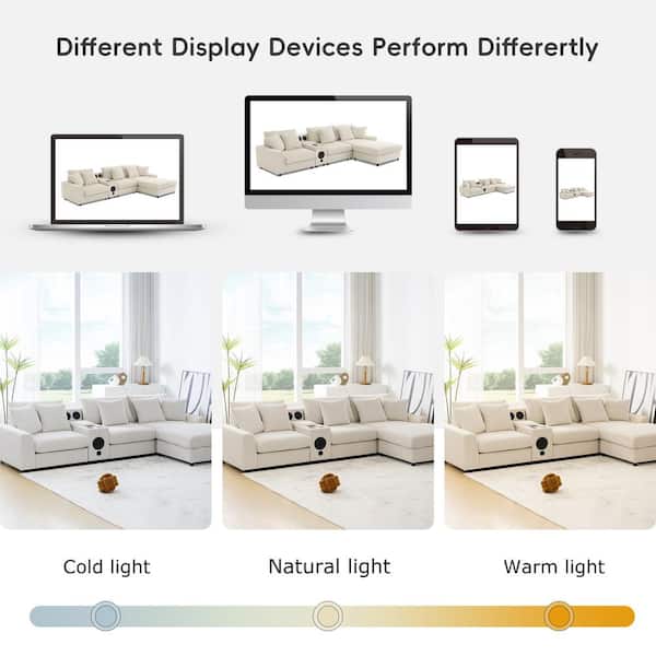 114 in. Corduroy L-Shape Sectional Sofa in Cream with Ottoman, Bluetooth Speakers, Console, Wireless Charging