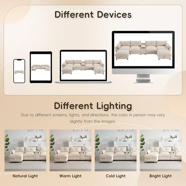 142 in. Chenille Modular Sectional Sofa Beige with Storage Ottoman and Console, Cup Holder, USB Charger