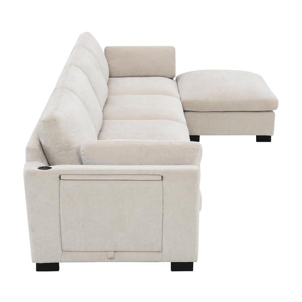 144 in. Chenille L-Shape Sectional Sofa in. Beige with Ottoman, Folding Table, Dual-Port Charging, Side Storage Pockets