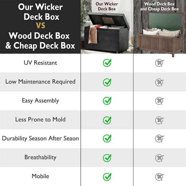 200 Gal. Black Wicker Deck Box with Wheels, All-Weather Outdoor Rattan Box, Storage Bin for Patio Furniture