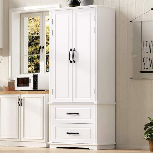 4-Shelf White Farmhouse Kitchen Pantry Organizer with 2-Large Drawers, 8-Door Shelves