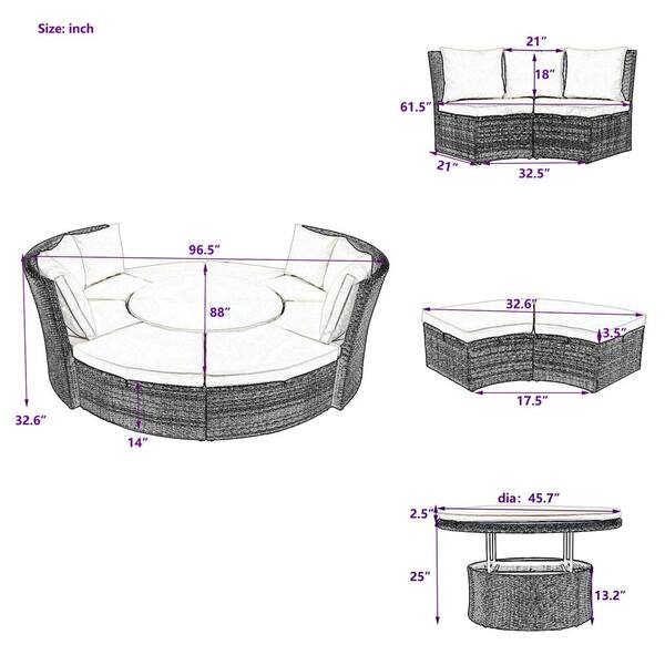 5-Piece Gray Wicker Outdoor Sectional Set, Free Combination Daybed with Liftable Table and Washable Beige Cushions