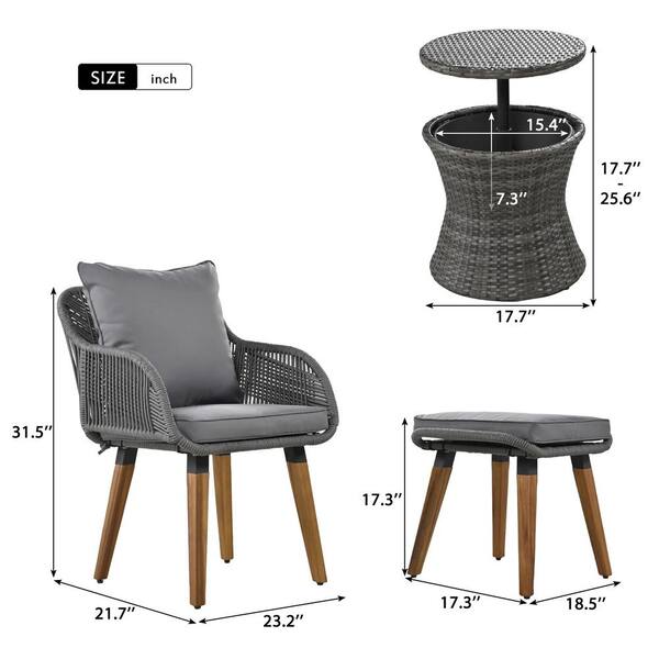 5-Piece Gray Wicker Patio Conversation Set with Ottoman, Bistro Set with Gray Cushions, Wicker Cool Bar Table