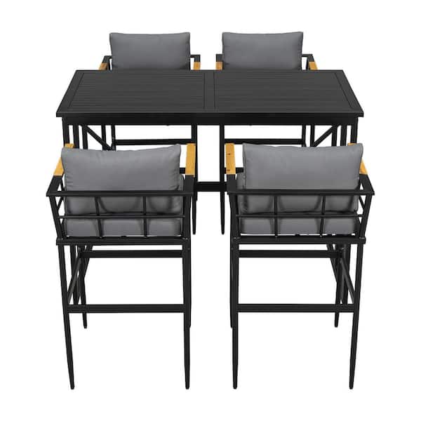 5-Piece Metal and Wood Outdoor Dining, Bar Table Set with Gray Cushions