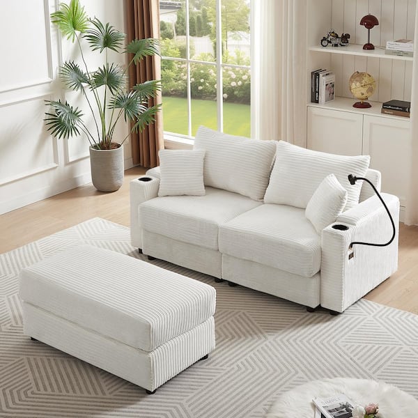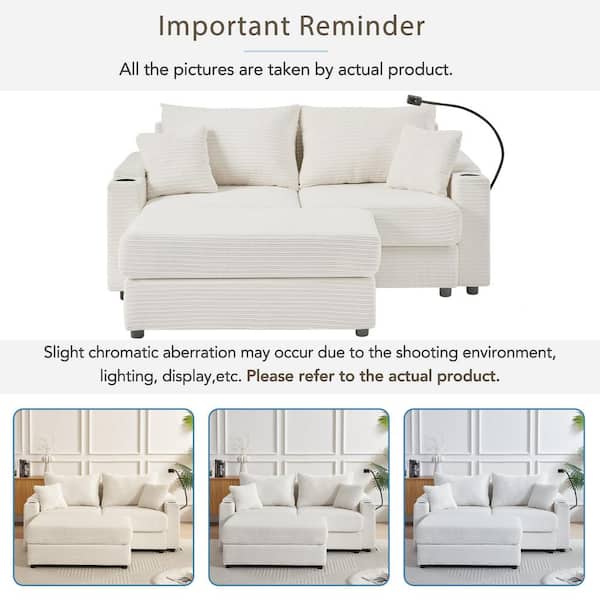 72.8 in. Corduroy Sectional Sofa in Beige with Ottoman, Storage Armrests, 2 USB Ports, 2 Cup Holders and Phone Holder