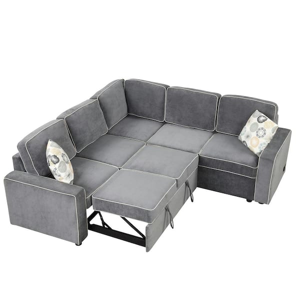 83 in. L Shaped Modern Linen Sectional Sofa Convertible Sleeper Sofa in Gray with USB Ports, Power Sockets and 3 Pillows