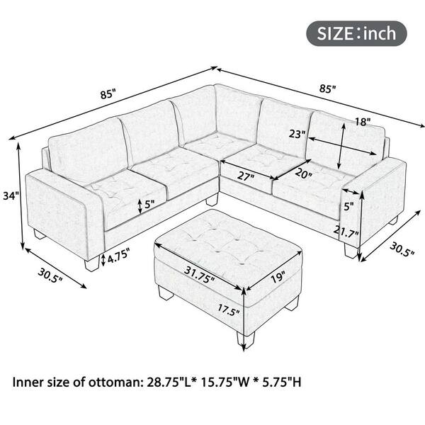 85 in. Square Arm 4-Seater Storage Sofa in Light Gray