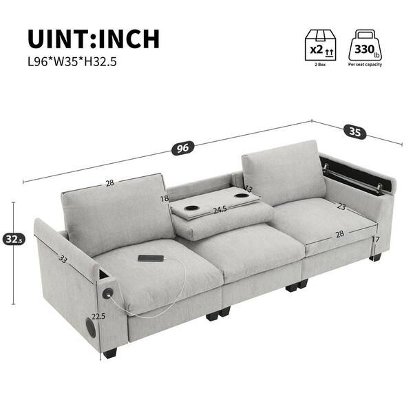 96 in. Flared Arm Chenille Rectangle Sofa in Gray with Bluetooth Speaker, Storage Armrest, Cup Holders, USB Charger