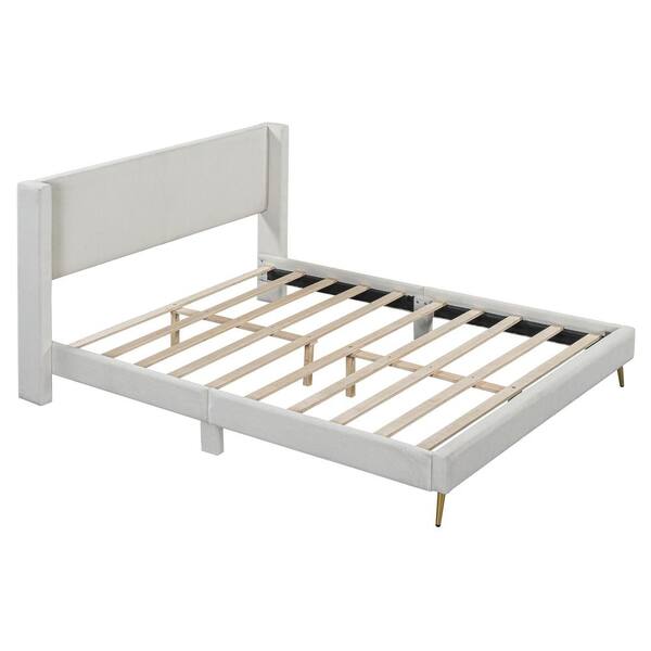 Beige Wood Frame Queen Size Corduroy Platform Bed with Metal Legs