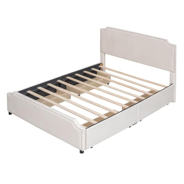 Beige Wood Frame Queen Upholstered Platform Bed with Stud Trim Headboard and Footboard and 4-Drawers