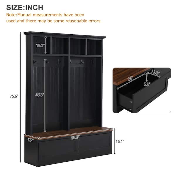 Black 55.9" W Multifunctional 4-in-1 Farmhouse Hall Tree with 6 Hooks, Dark Walnut Wood Grain Bench, 2-Drawers