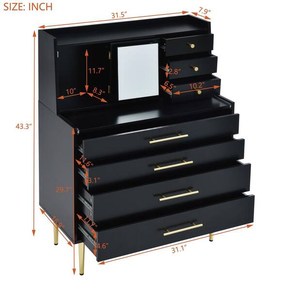 Black 7-drawer 31.5 in. Wide Dresser with Mirror and Retractable Desktop