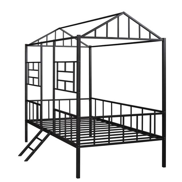 Black Metal Twin Size House Platform Bed with Mini Ladder, Full-Length Guardrails and Slats Support