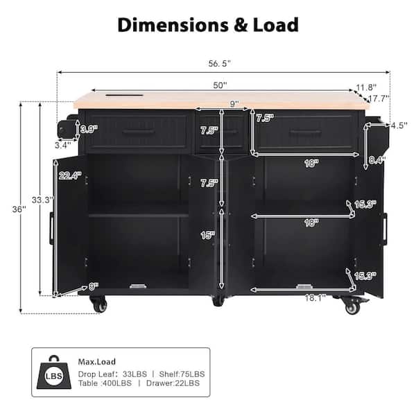 Black Wood Kitchen Cart with Drop Leaf, Power Outlet, 4 Door Shelves, 6 Deep Drawers