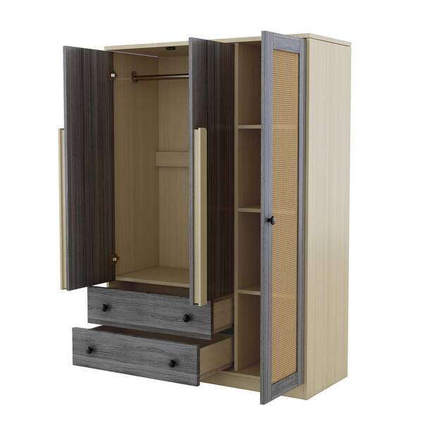 Black and Natural Wood 47.2 in. 6-Door Rattan Wardrobe Armoire with 2-Drawers, Storage Shelves, Hanging Rail