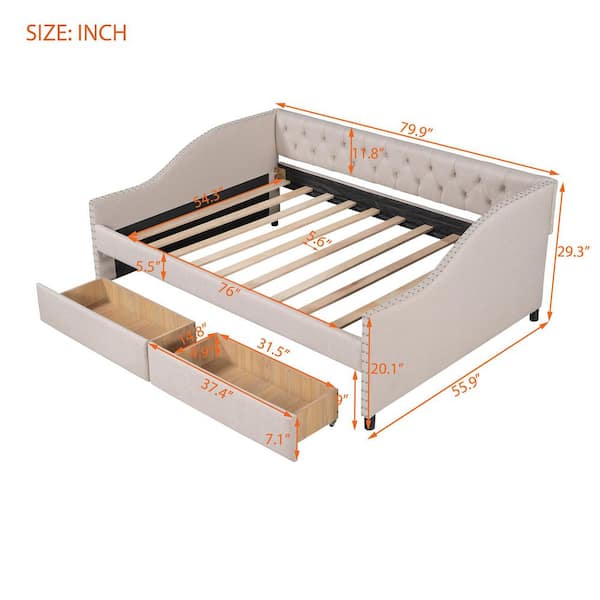 Button-Tufted Beige Wood Full Size Linen Upholstered Daybed with 2-Drawer and Nail head Trim