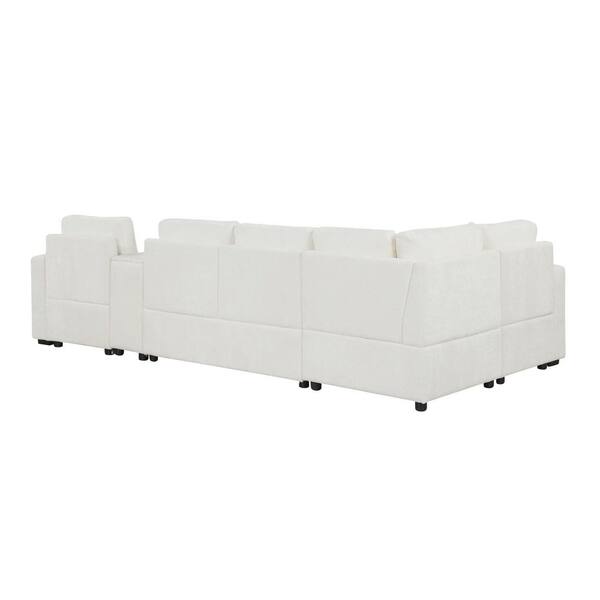 Convertible 120.5 in Chenille Sectional Sofa in White with Pull-Out Bed, Console with Cup Holders, Drawer, Flip-Top Box