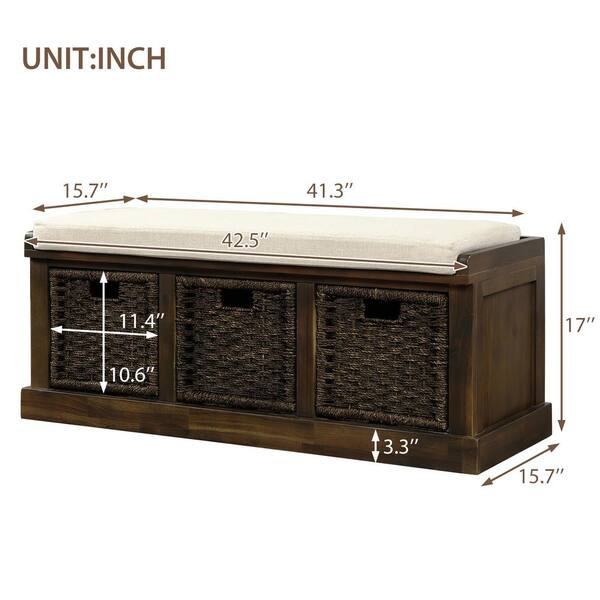 Dark Brown Entryway Storage Bench with Removable Cushion and 3-Removable Classic Fabric Basket