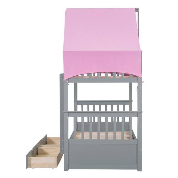Detachable Gray Twin over Twin Wood Bunk Bed with Pink Tent, 2-Drawer and Built-in Ladder