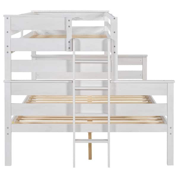 Detachable Style White Twin XL over Queen Wood Bunk Bed with Built-in Ladder, Full-Length Bedrails